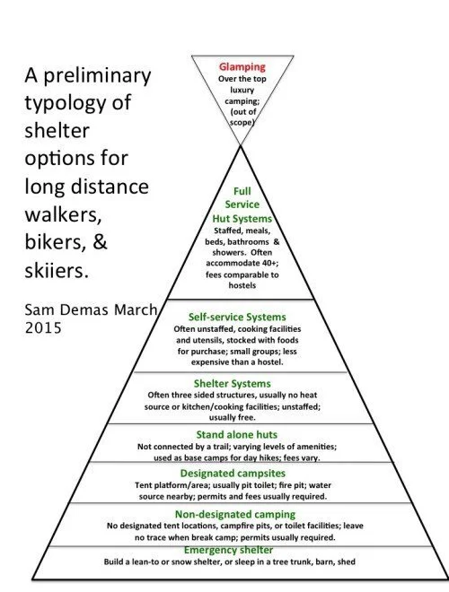 While this preliminary typology may seem logical, it doesn’t really represent the full complexity of huts. For example, it is not unusual for the huts in a single system to vary significantly and seasonally in whether they are staffed and in the amenities provided. Here is a different representation of the same typology (with apologies to Maslow), but providing a bit more context and nuance on the choices walkers have.